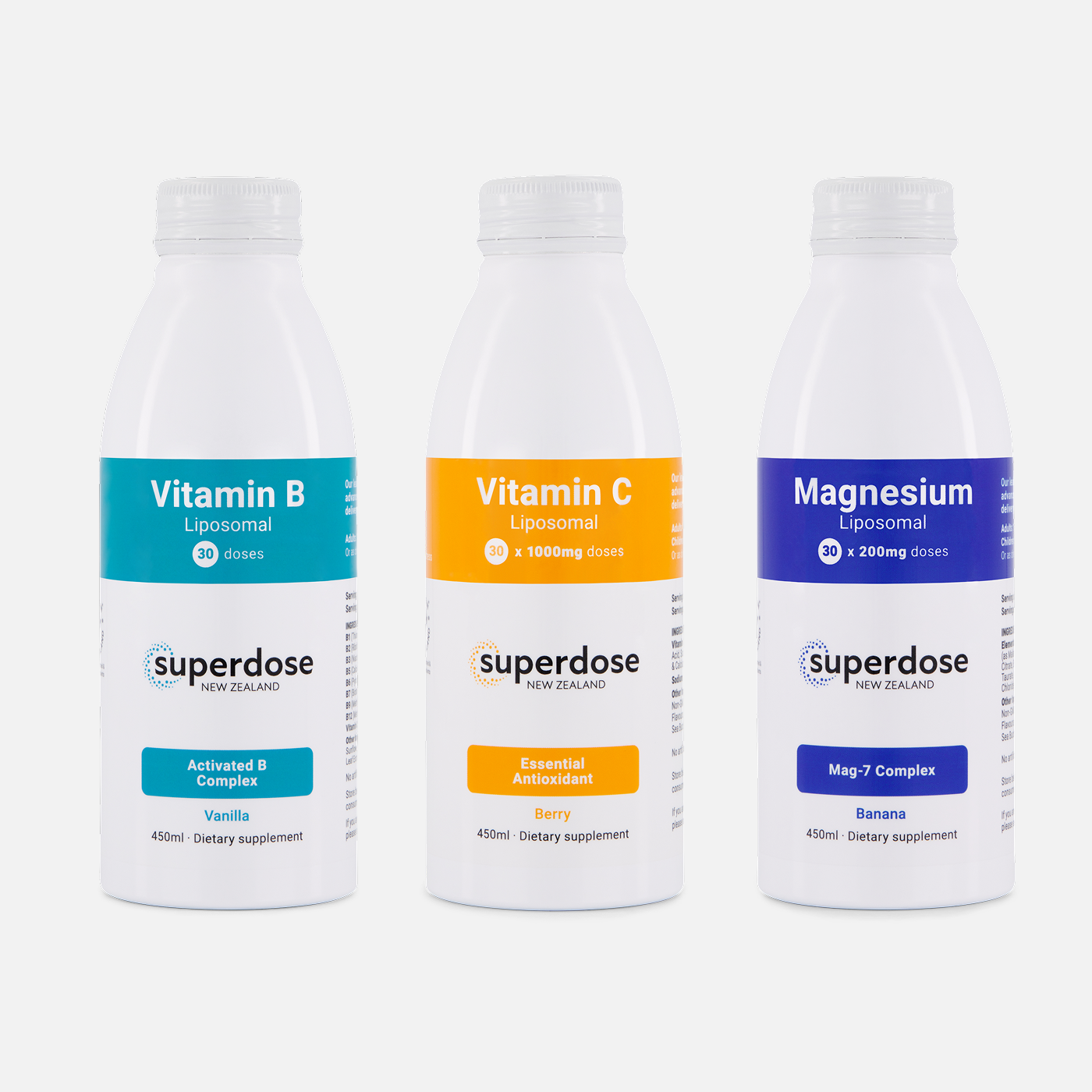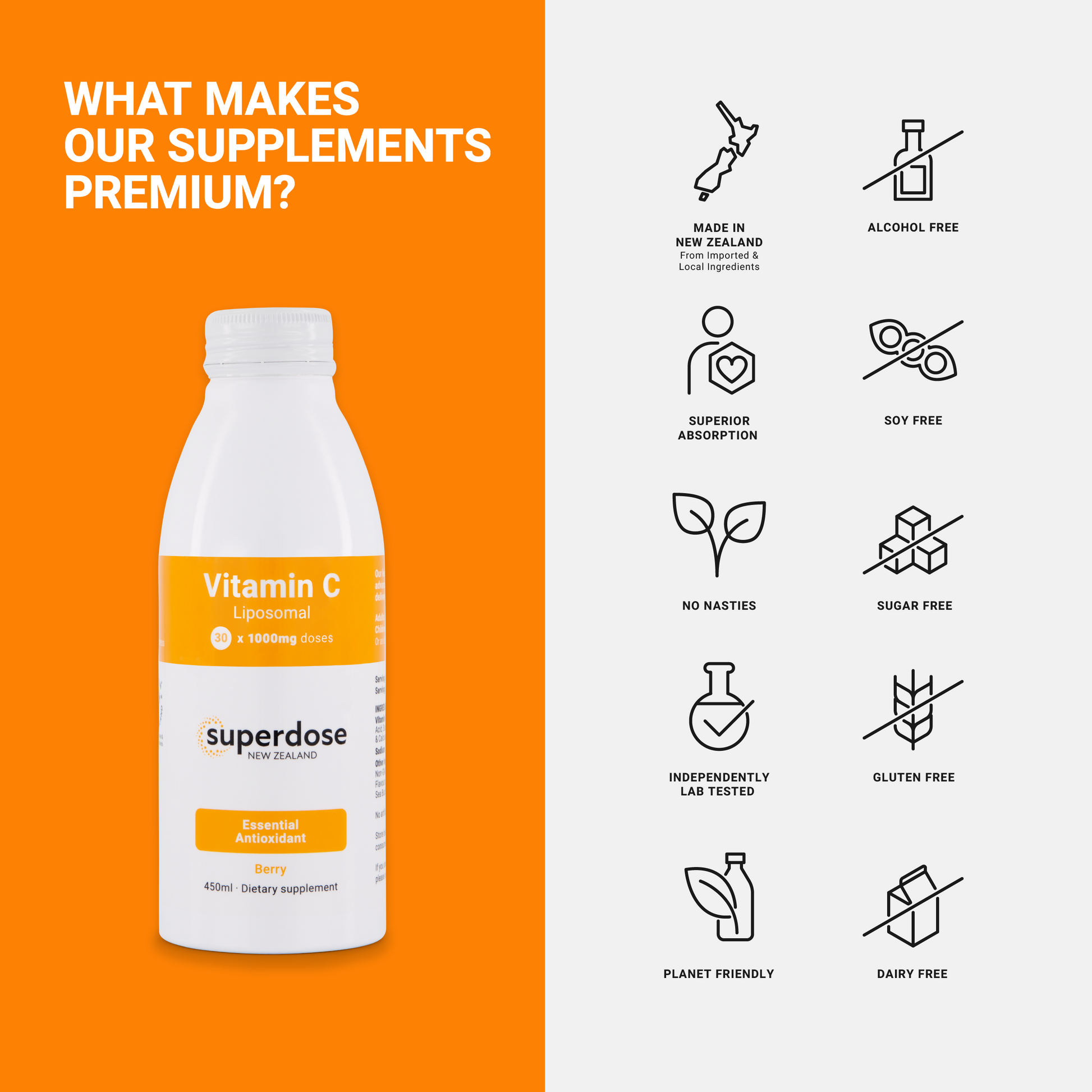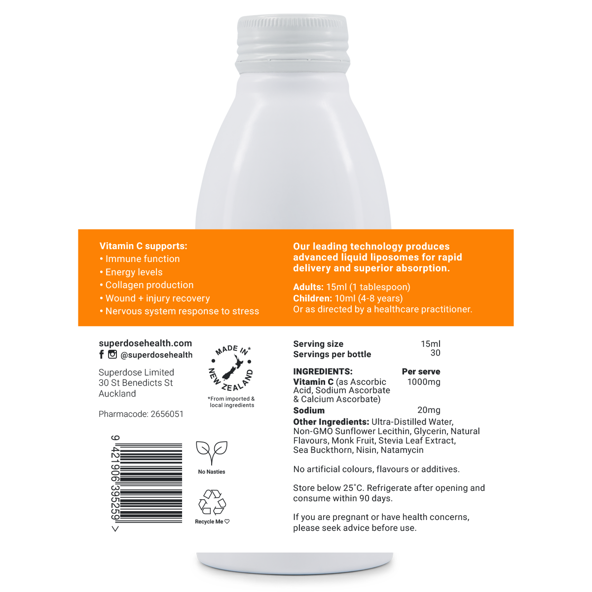 If pregnant or have health concerns, please seek advice before use. Vitamin C may aggravate or lead to the formation of kidney stones or excess iron in certain people. Always read the label and use as directed. Vitamins are supplementary to a balanced diet. Superdose Ltd, Auckland